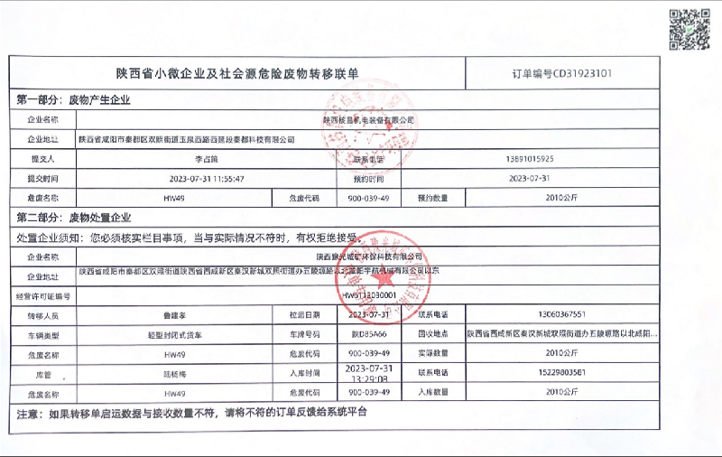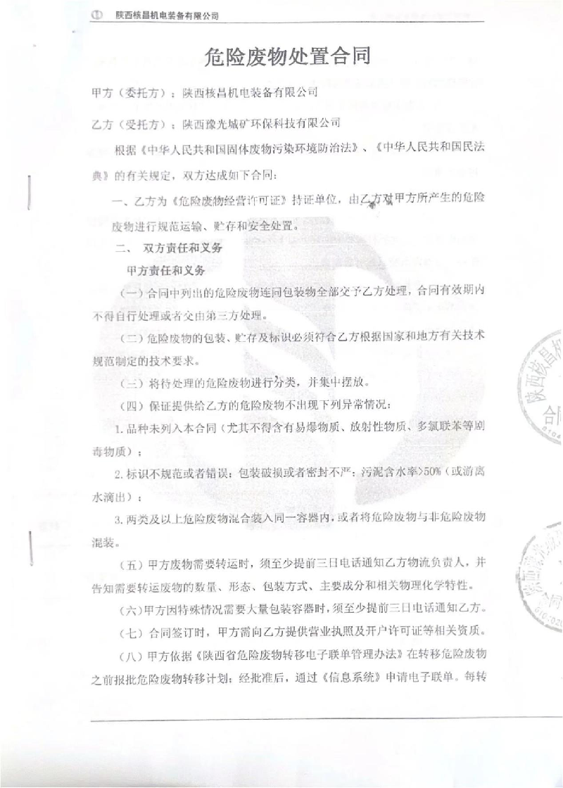 我公司屬于機(jī)電一體化、機(jī)械加工等產(chǎn)業(yè)的生產(chǎn)經(jīng)營企業(yè),現(xiàn)階段主要的危險(xiǎn)廢物包括:油漆桶、廢機(jī)油、乳化液、噴漆、噴砂、油漆桶、廢機(jī)油、乳化液等危險(xiǎn)廢物,處置由陜西豫光城礦環(huán)??萍加邢薰境薪愚D(zhuǎn)運(yùn)及處理。噴漆、噴砂房等由公司投入大量資金進(jìn)行升級(jí)改造,在經(jīng)營活動(dòng)中加強(qiáng)職工環(huán)保培訓(xùn),不斷提升職工環(huán)保意識(shí)。經(jīng)陜西中天環(huán)保有限公司監(jiān)測(cè),所排廢氣均達(dá)到國家標(biāo)準(zhǔn),為改善環(huán)境、大氣質(zhì)量作出積極的貢獻(xiàn)。